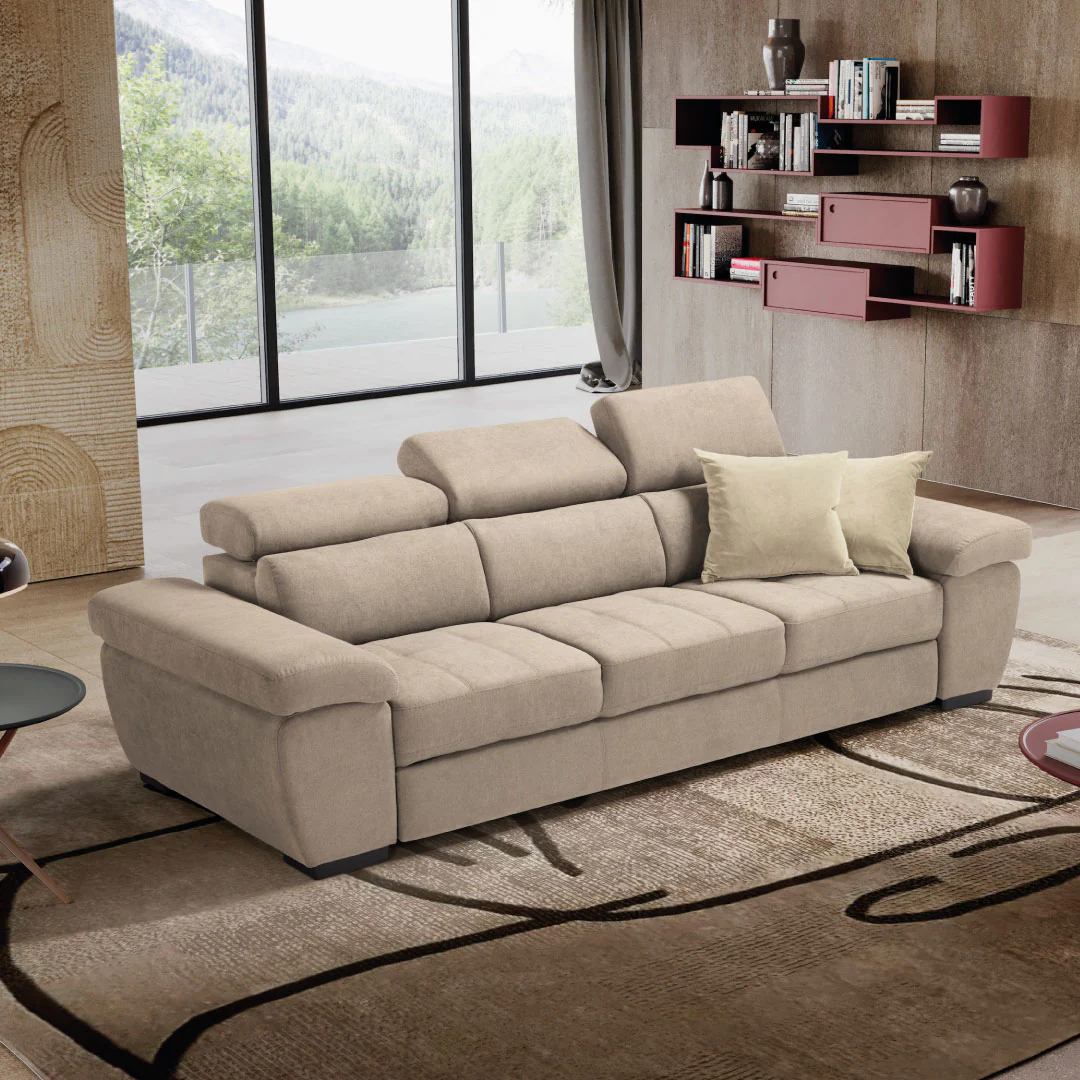 Alexa di Komodo è il divano che si adatta a qualsiasi tipologia di arredo. Le sue linee morbide e semplici garantiscono una comodità senza eguali. È dotato di 3 poggiatesta regolabili manualmente studiati per il massimo confort della zona cervicale e un carrello estraibile che lo trasforma in pochi secondi in un pratico letto.