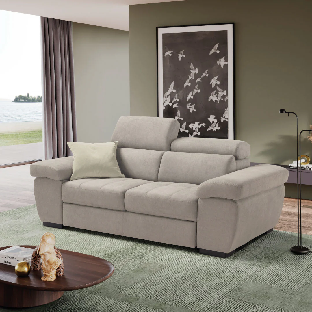 Alexa di Komodo è il divano che si adatta a qualsiasi tipologia di arredo. Le sue linee morbide e semplici garantiscono una comodità senza eguali. È dotato di 2 poggiatesta regolabili manualmente studiati per il massimo confort della zona cervicale e un carrello estraibile che lo trasforma in pochi secondi in un pratico letto.