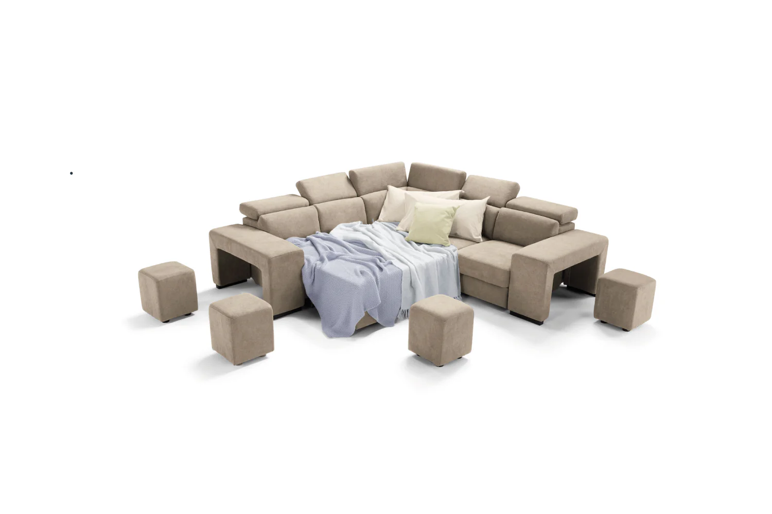 TALENTO di Komodo è il divano angolare con il miglior rapporto qualità-prezzo. È dotato di 6 poggiatesta regolabili manualmente studiati per il massimo confort della zona cervicale. I 4 pratici pouf collocati nella sezione laterale del divano gli donano un design contemporaneo, al contempo utili come sedute extra. Un pratico carrello estraibile lo trasforma in pochi secondi in un divano letto. La composizione è completata da un cassetto portaoggetti collocato sotto la poltrona jolly.