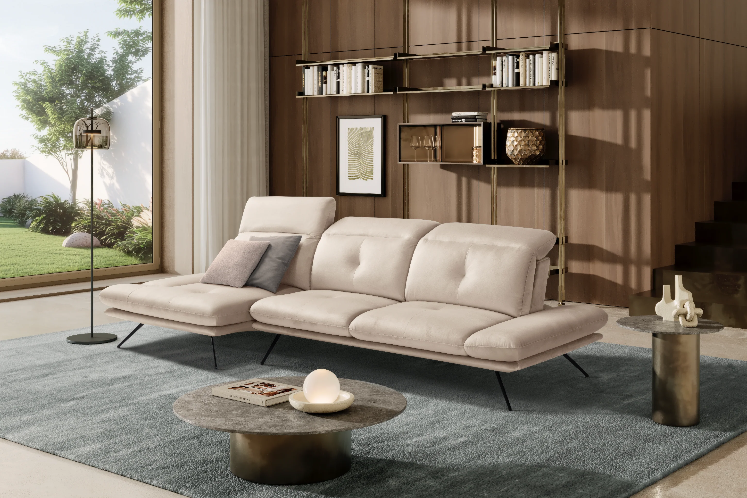 La versione chaise longue del divano Miranda offre una seduta ampia e accogliente, senza rinunciare alla raffinatezza. I poggiatesta regolabili manualmente si adattano alle esigenze di ogni ospite, garantendo il massimo supporto cervicale. Le sottili gambe in metallo e la silhouette morbida ed essenziale si integrano con naturalezza in qualsiasi ambiente living.