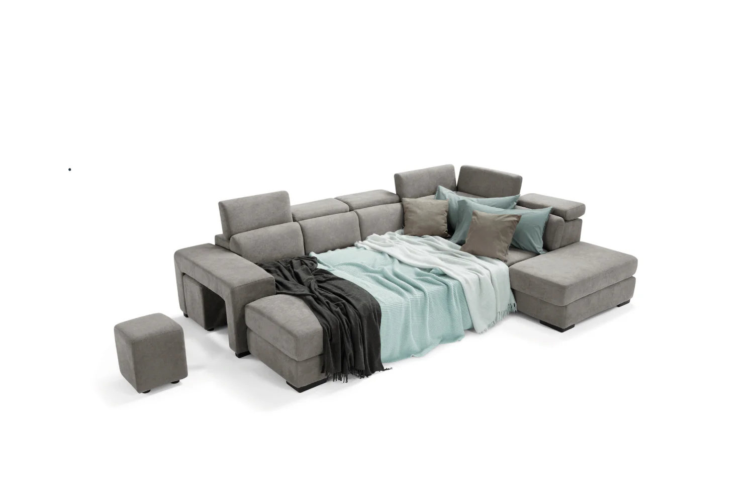 TALENTO di Komodo è il divano angolare 2 posti con chaise longue e angolo terminale con il miglior rapporto qualità-prezzo. È dotato di 6 poggiatesta regolabili manualmente studiati per il massimo confort della zona cervicale. I 2 pratici pouf collocati nella sezione laterale del divano gli donano un design contemporaneo, al contempo utili come sedute extra. Un pratico carrello estraibile lo trasforma in pochi secondi in un divano letto. La composizione è completata da un pouf contenitore.